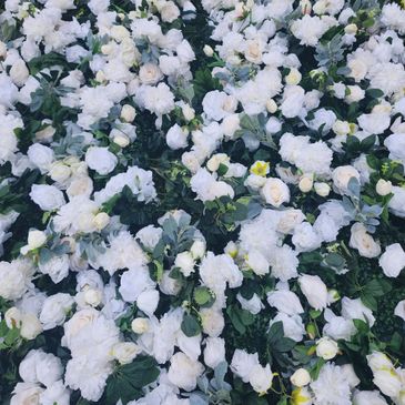 The wall is lush and textured, covered densely with a mix of white blooms and vibrant greenery. Soft white flowers are artfully arranged to create a dreamy, romantic canvas. Size if 8x8 ft